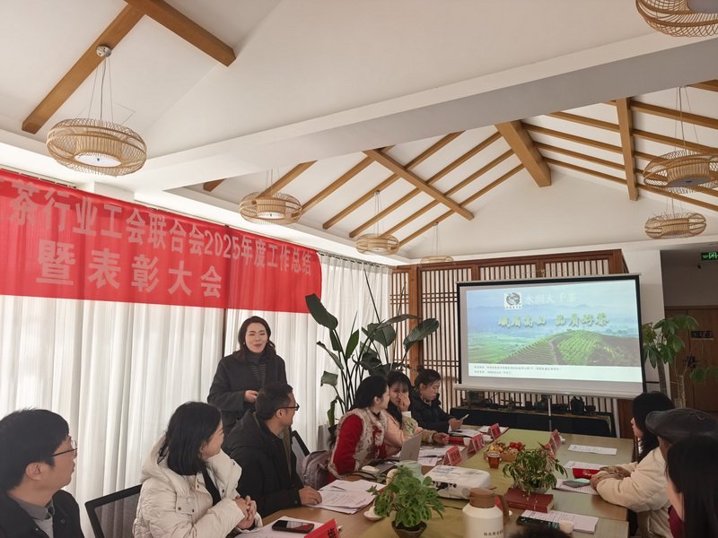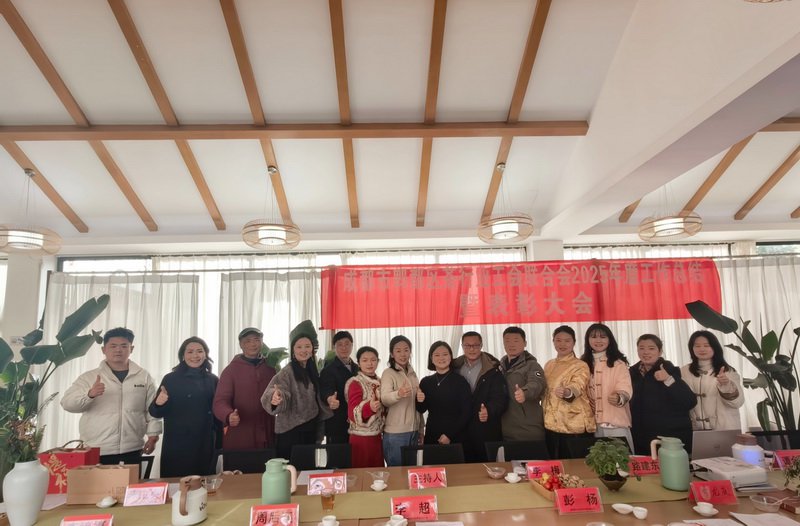 2025 年 1 月 26 日,成都市郫都区茶行业工会联合会 2025 年度工作总结暨表彰大会圆满举行。来自辖区内会员单位的代表与全体职工同仁齐聚一堂,回顾过往一年的奋进历程,表彰行业先进标杆,共商 2026 年发展大计,整场大会洋溢着凝心聚力、共谋发展的热烈氛围。 会议伊始,郫都区茶行业工会联合会主席李梅向新加入的职工代表细致解读了工会的职能定位与服务宗旨,让新成员充分了解工会在维护职工权益、助力职业成长、搭建行业桥梁等方面的重要作用。随后,李梅全面汇报了 2025 年工会工作成效:聚焦职工技能提升,组织开展多场技能培训、岗位比武及专业竞赛活动,更牵头助力四川首届调饮师培训落地实施,为茶行业技能人才培养注入动力;关注职工精神文化需求,策划举办系列读书会等文体活动,丰富职工精神生活,助力身心健康发展。同时,李梅还明确了 2026 年工会工作重点任务,为新一年的工作划定清晰方向。